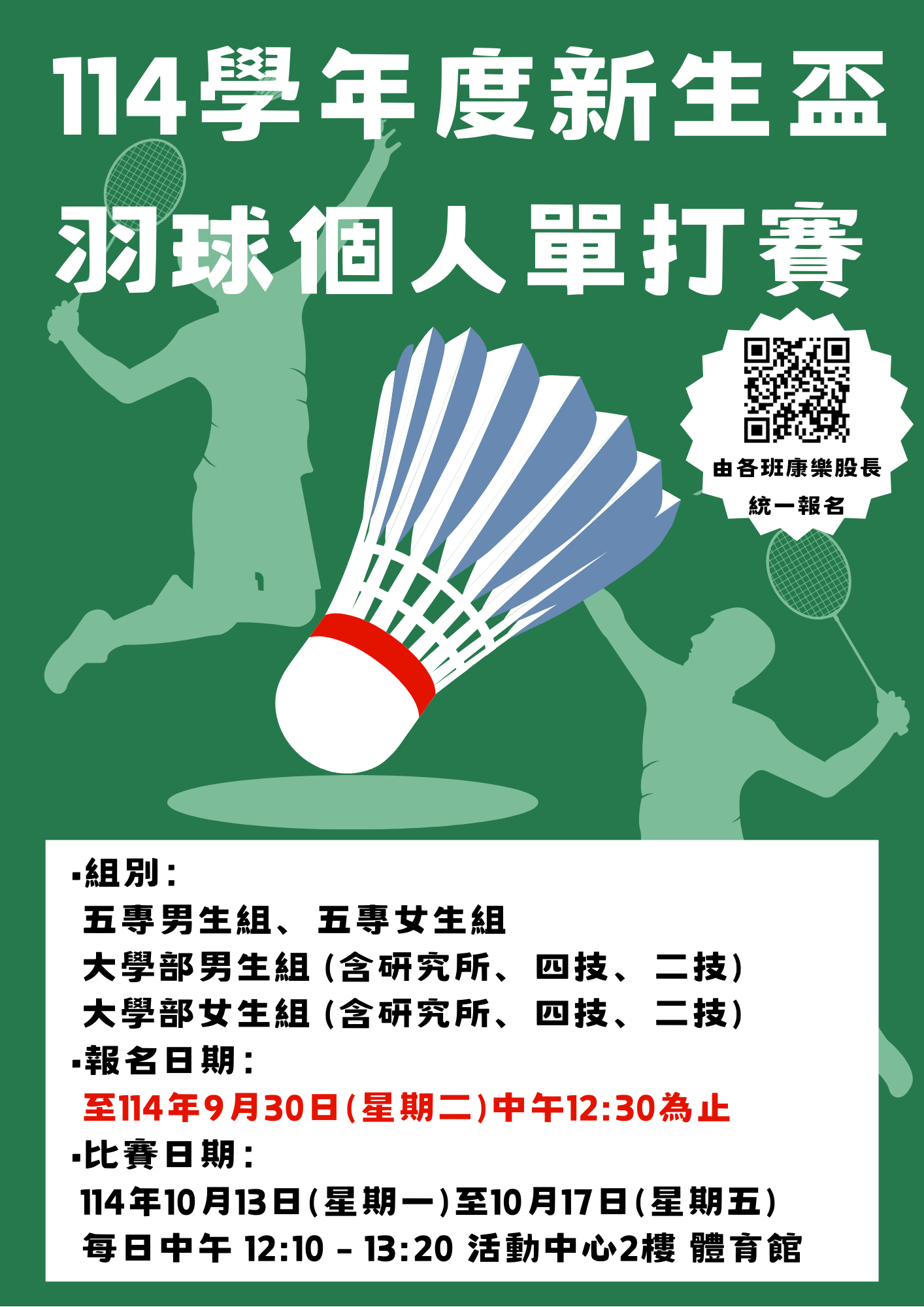 「114學年度新生盃羽球個人單打賽」,歡迎同學踴躍報名參加。