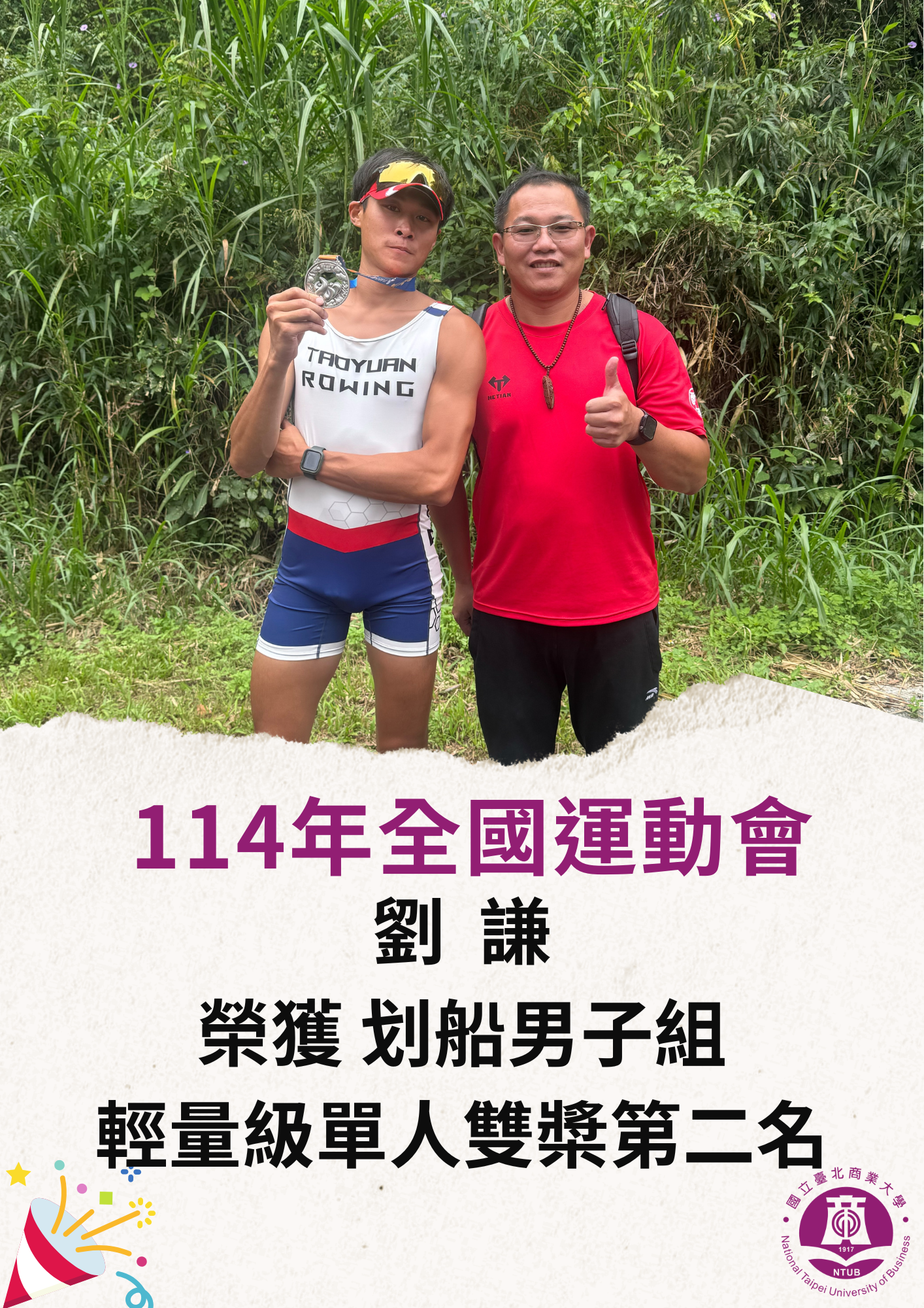 【賀】本校劉謙同學 參加114年全國運動會 榮獲划船男子組 輕量級單人雙槳第二名