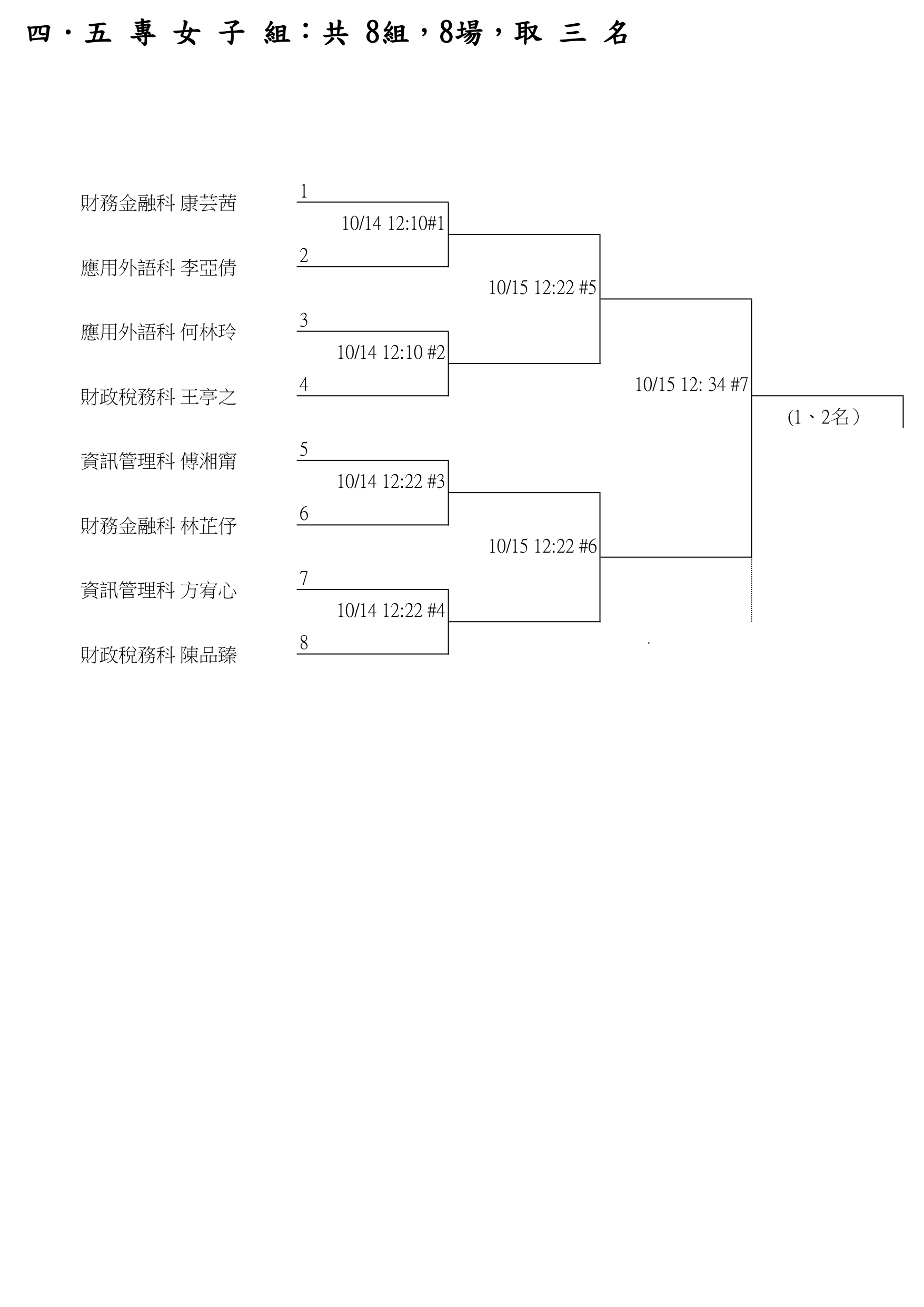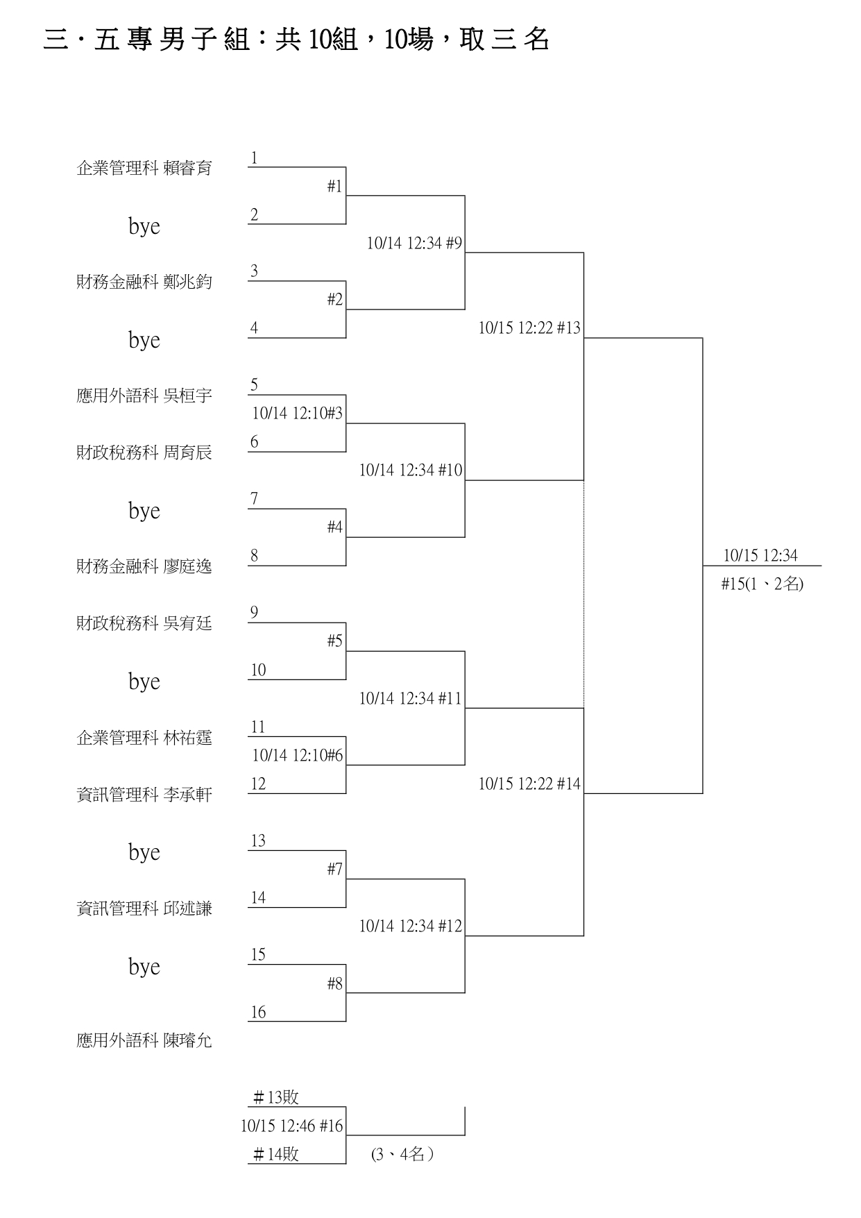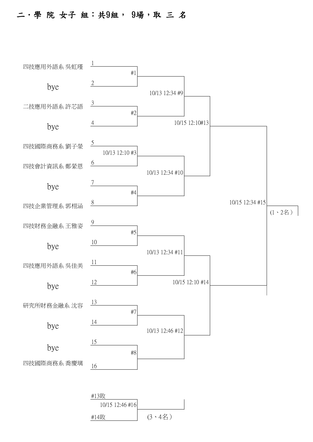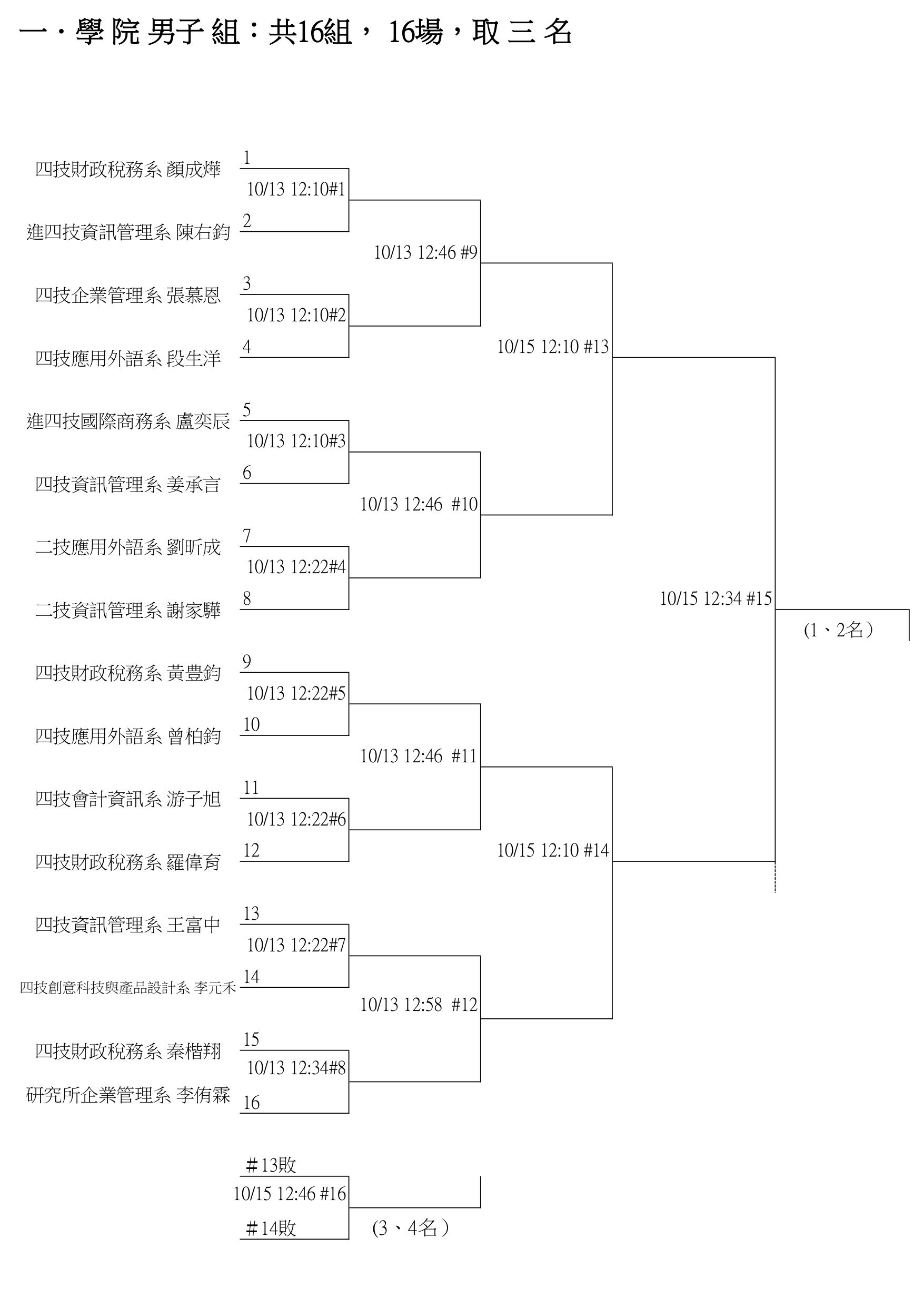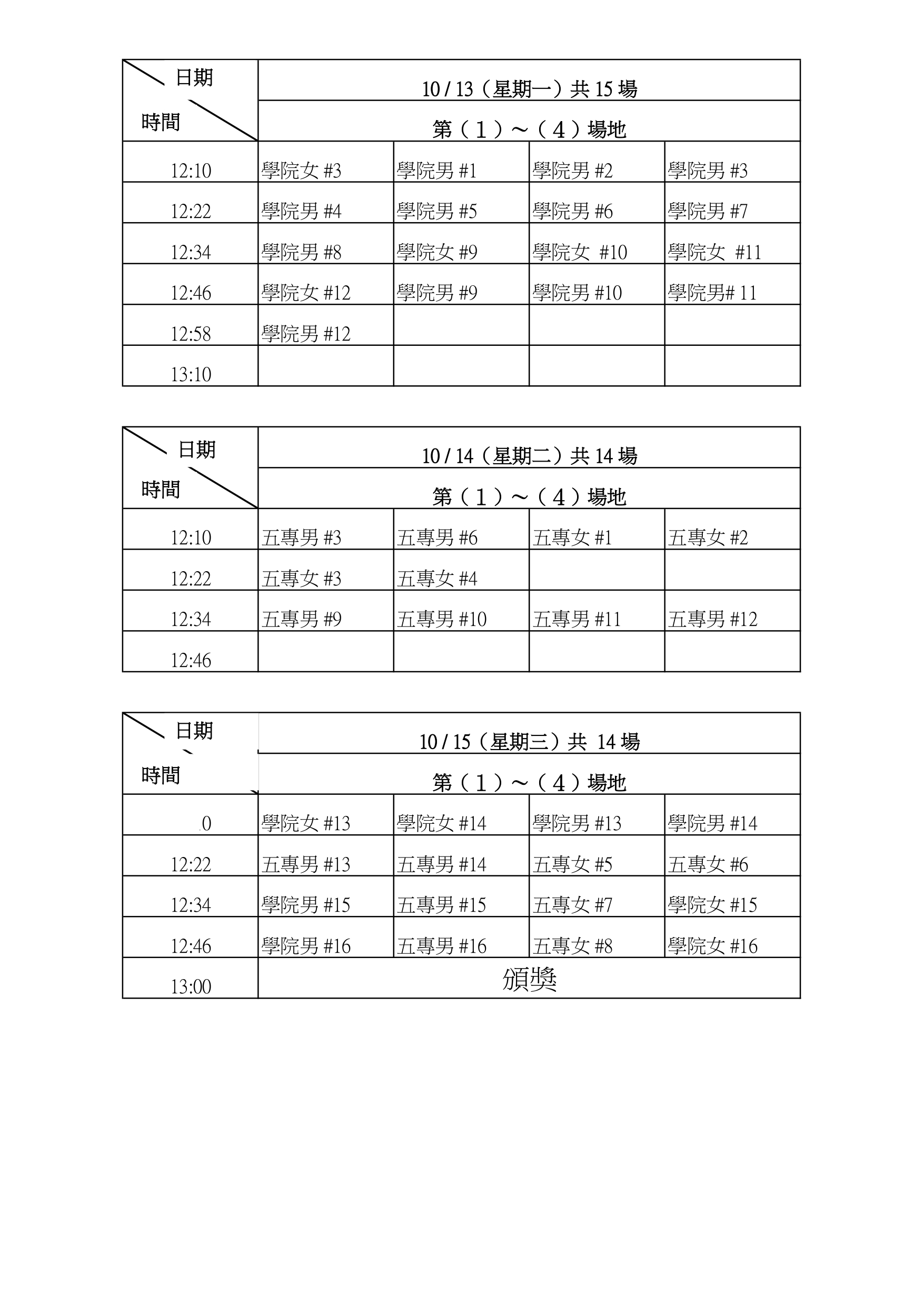 賽程表已公布在體育館2樓佈告欄上,請選手們依公告賽程前15分鐘辦理報到。
