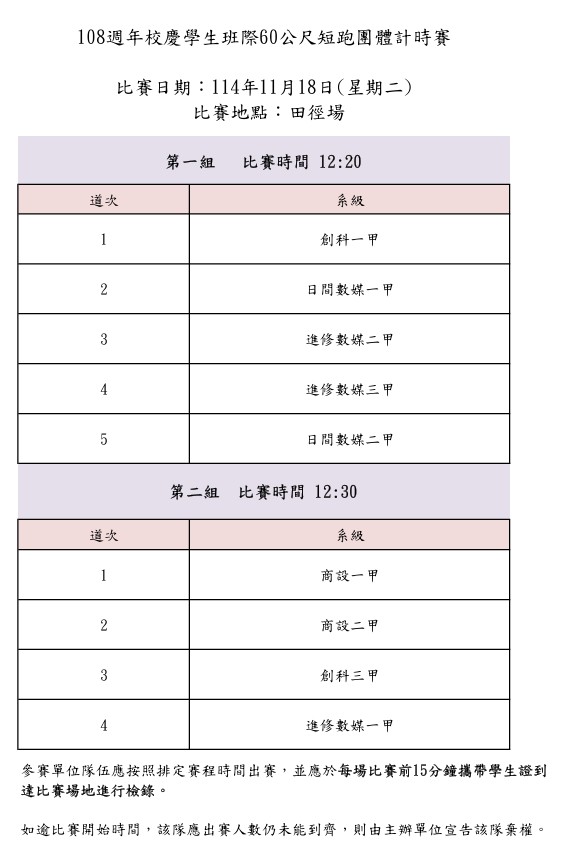 【公告】桃園校區-108週年校慶學生班際60公尺短跑團體計時賽 賽程公告