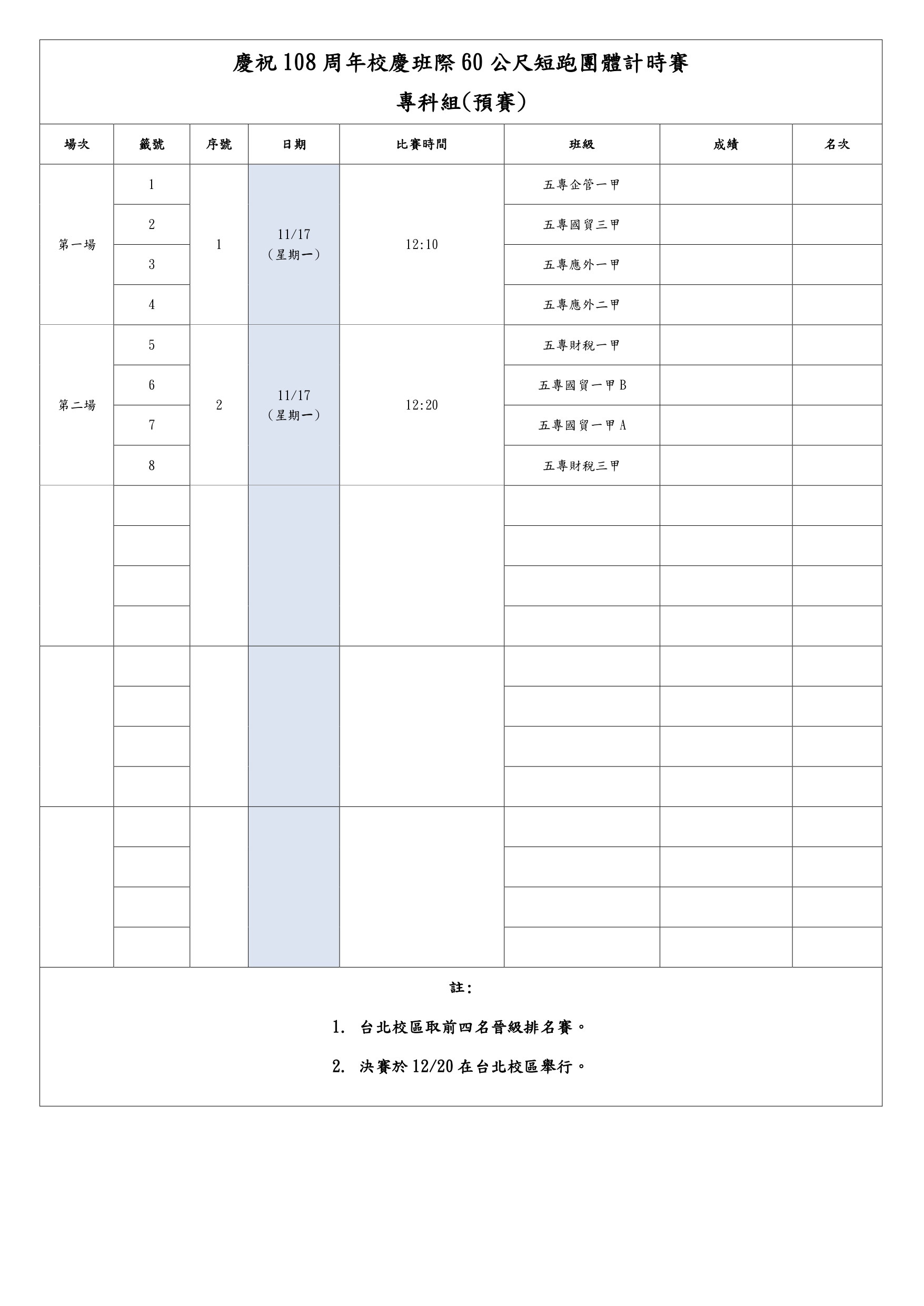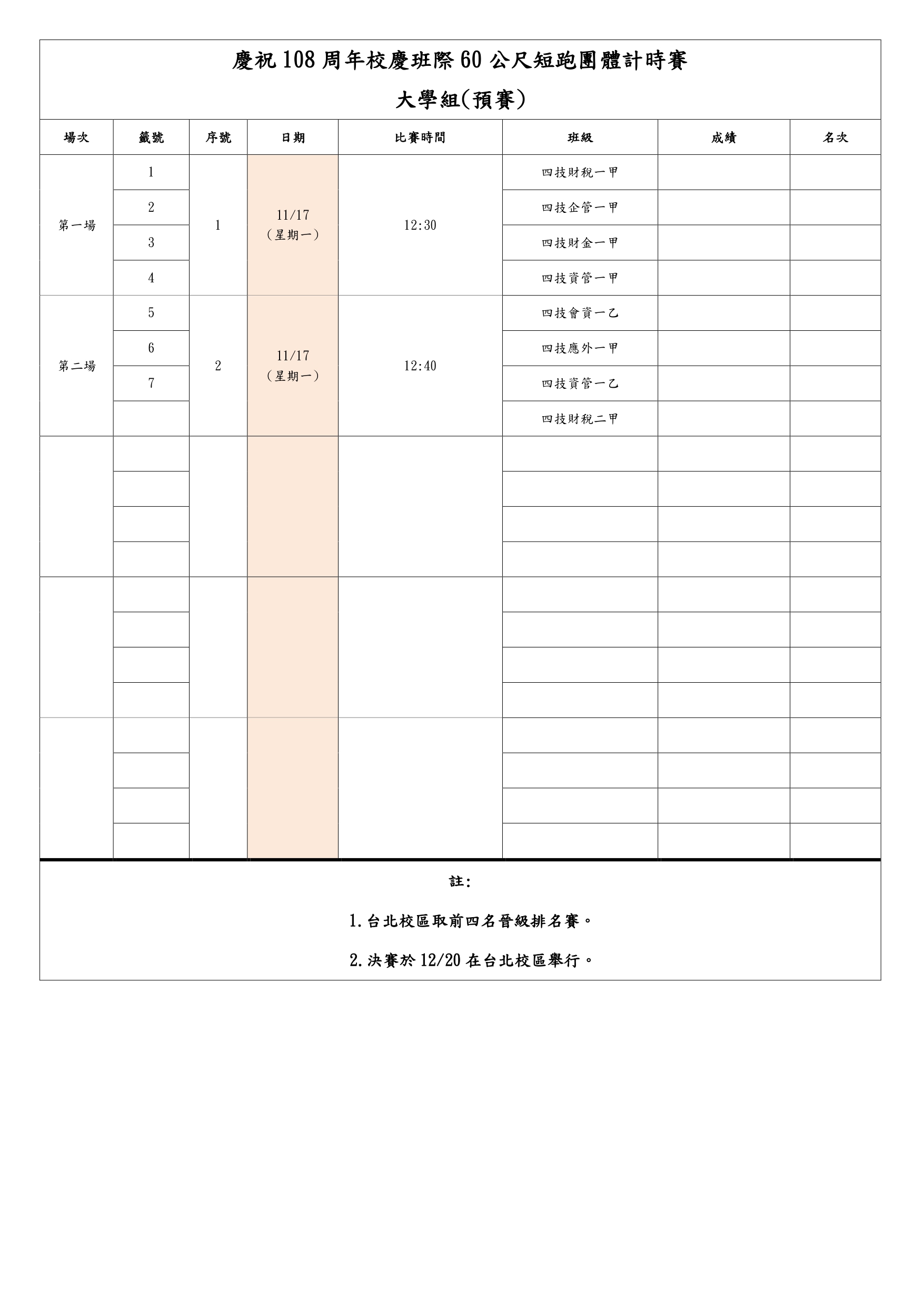 【公告】台北校區-108周年校慶 學生60公尺短跑團體計時賽賽程表