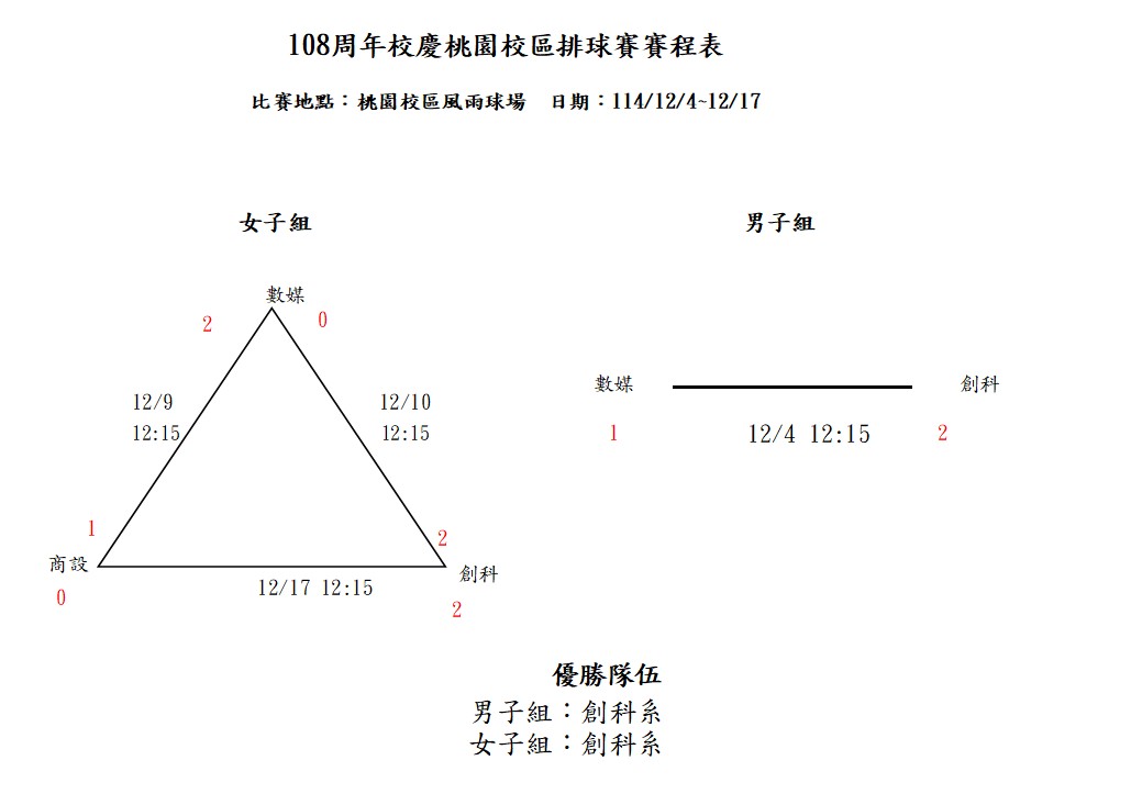 【公告】桃園校區-108週年校慶學生排球賽 成績公告