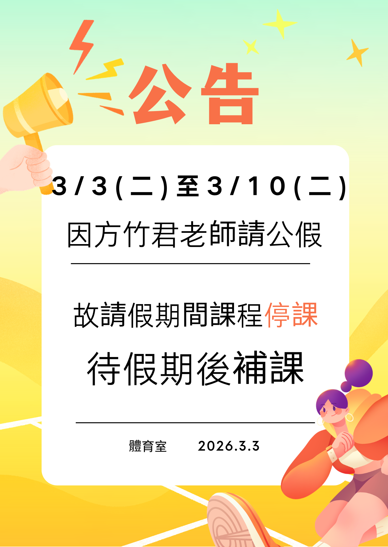 【公告】3/3(二)至3/10(二)方竹君老師因請公假,故請假期間課程停課 待假期後補課