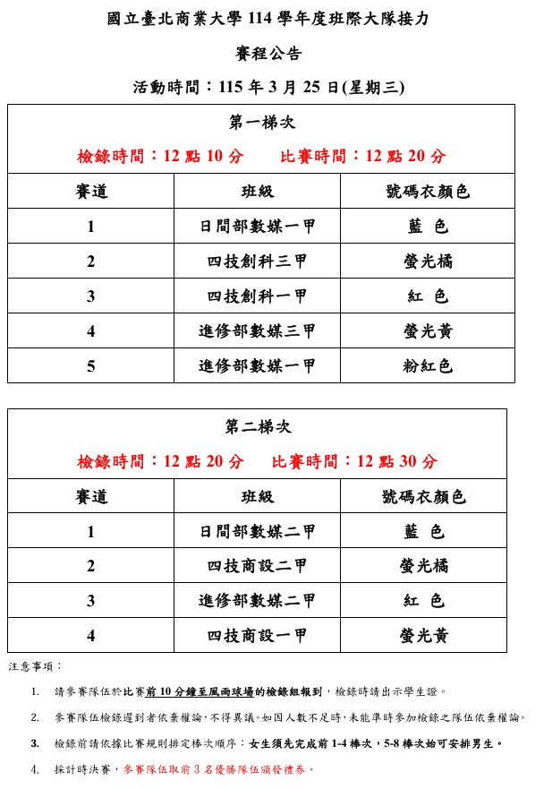 【公告】(桃園校區)114學年度班際大隊接力競賽 賽程公告
